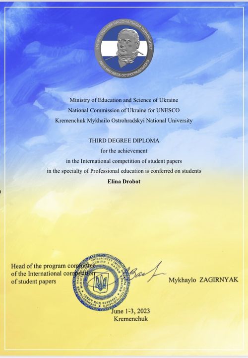 Диплом переможника третього ступеня у Міжнародній студентській олімпіаді зі спеціальності "Професійна освіта", отримала студентка І курсу другого (магістерського) рівня вищої освіти факультету педагогіки, психології та мистецтв (кафедра мистецької освіти) ЦДУ ім. В. Винниченка Еліна Дробот за темою: "Формування сценічно-образної культури майбутнього вчителя музичного мистецтва у позанавчальній театральній діяльності".