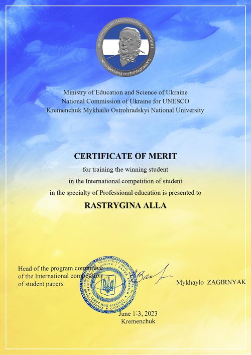 Похвальну грамоту за підготовку студента-переможця у Міжнародній студентській олімпіадізі спеціальності "Професійна освіта", отримала керівник конкурсної роботи, доктор педагогічних наук, професор, професор кафедри мистецької освіти Алла Растригіна.