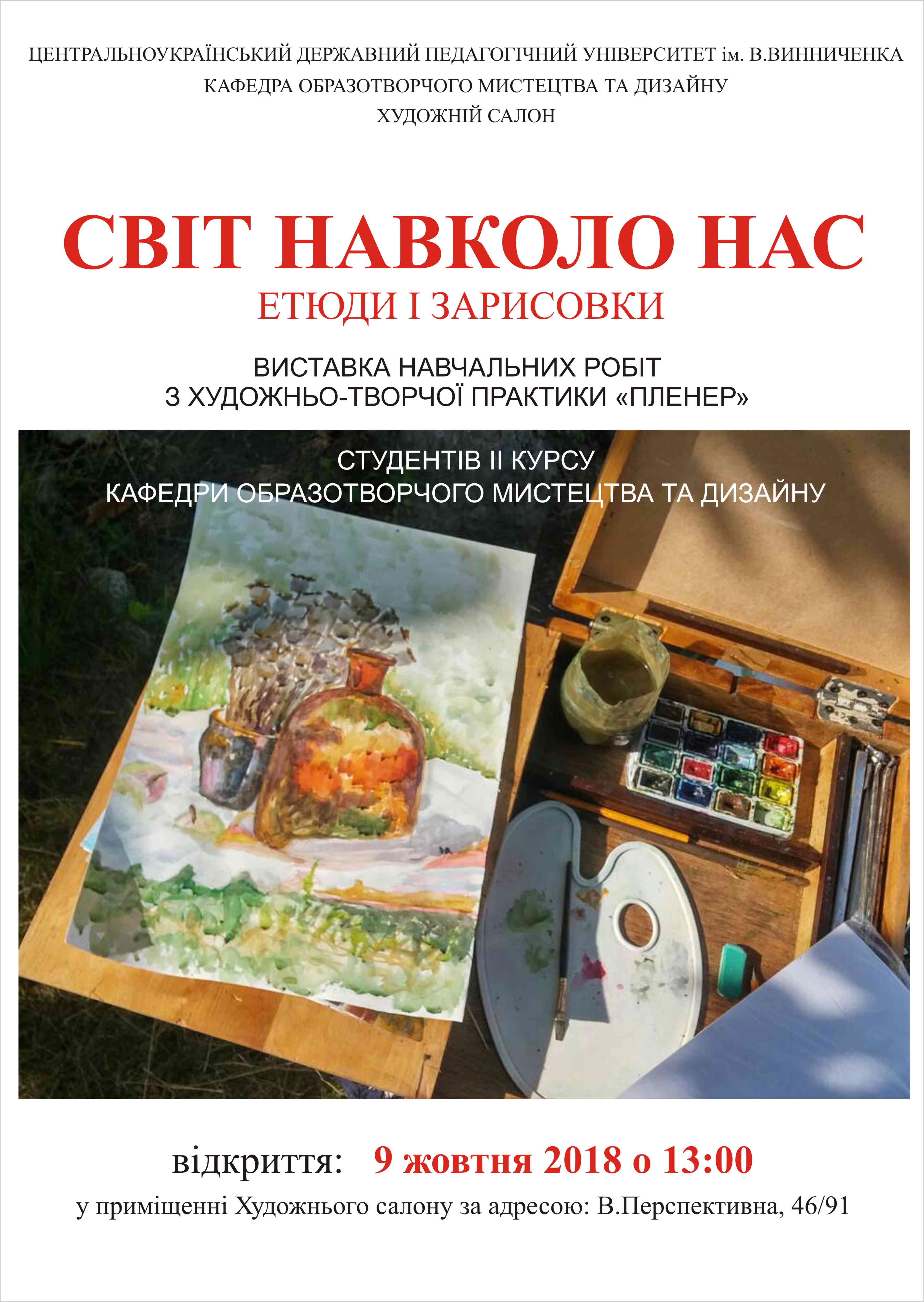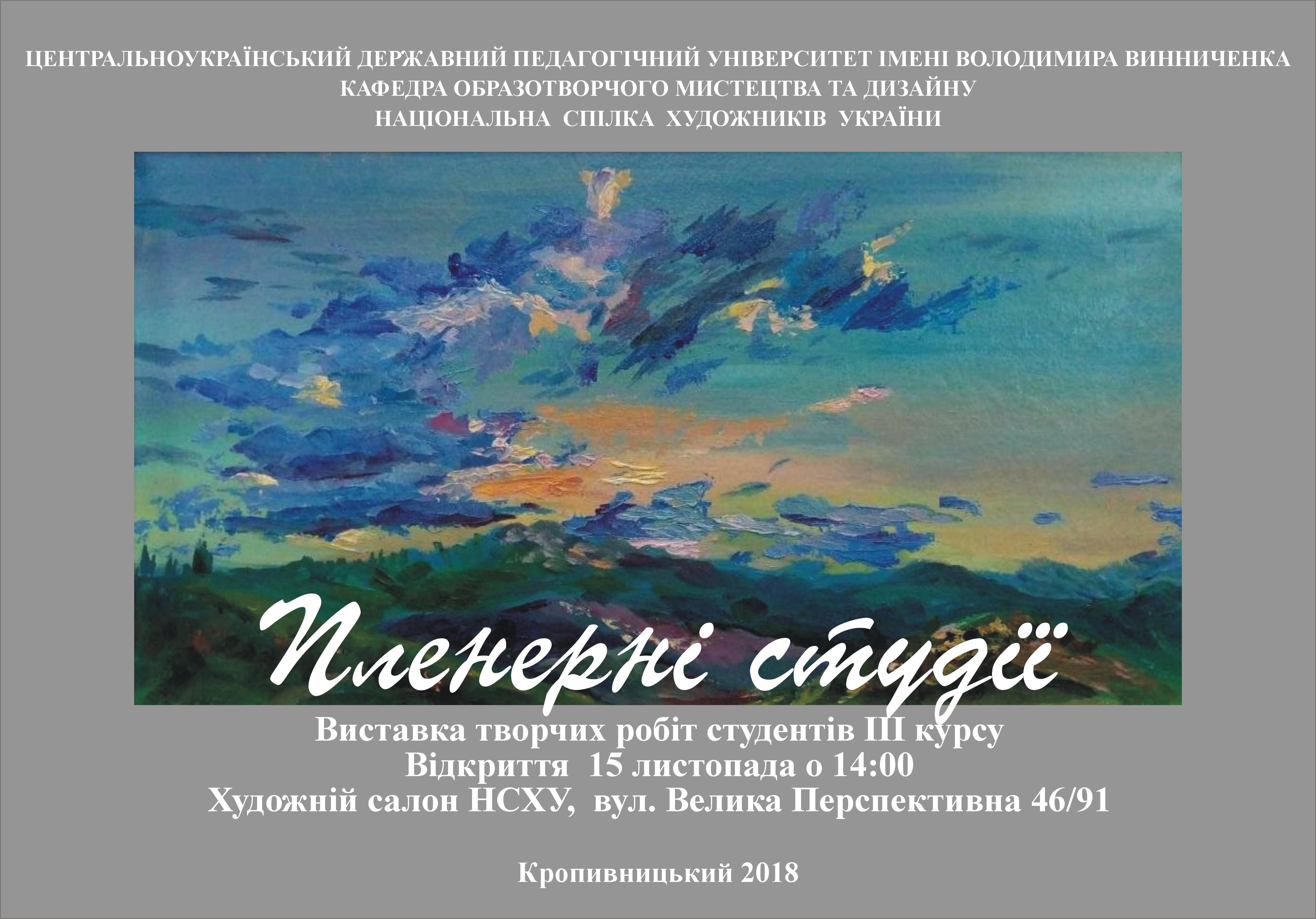 На пропонованій глядачеві виставці «Пленерні студії» представлено роботи студентів третього курсу кафедри образотворчого мистецтва та дизайну мистецького факультету Центральноукраїнського державного педагогічного університету імені Володимира Винниченка.