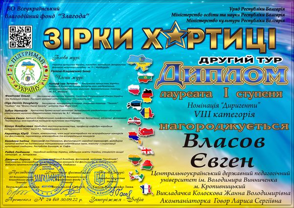 Євген Власов, студент ІV курсу спеціальності 014. Середня освіта. Музичне мистецтво, став лауреатом 1 ступеня у номінації "Диригенти" Міжнародного багатожанрового фестивалю-конкурсу "Зірки Хортиці", який проходив 27-28 серпня 2022 р. у Запоріжжі за сприяння БО Благодійного фонду "Злагода". Колектив кафедри мистецької освіти вітає з перемогою Євгена Власова, а також його викладача - к.п.н., доц., старшого викладача Колоскову Ж.В. та акомпаніатора Говор Л.С. Бажаємо здоров'я, наснаги та подальших успіхів на творчій ниві.