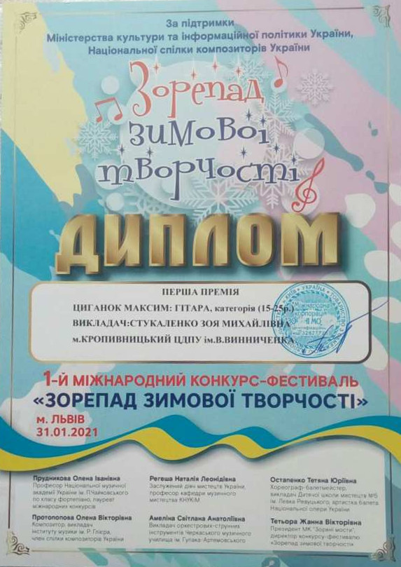 За запрошенням Центру освітніх інновацій та творчості «Гармонія» (м. Київ), студент І-го курсу мистецького факультету Центральноукраїнського державного педагогічного університету імені Володимира Винниченка Максим Циганок (клас кандидата педагогічних наук, ст. викладача Зої Михайлівни Стукаленко) взяв участь у Х Міжнародному багатожанровому дистанційному фестивалі-конкурсі мистецтв «Talent Fest» – і посів перше місце!