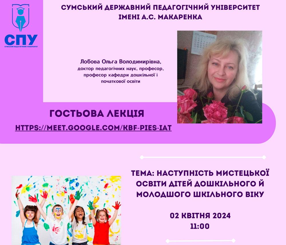 02 квітня 2024 року проведено гостьову лекцію для здобувачів першого (бакалаврського) рівня вищої освіти спеціальності 012 «Дошкільна освіта» Сумського державного педагогічного університету імені А. С. Макаренка.