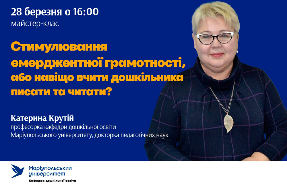 Під час вивчення дисципліни «Педагогіка дошкільна» з теми «Вікові та індивідуальні особливості дітей раннього та дошкільного віку» студенти першого курсу спеціальності 012 Дошкільна освіта відвідали майстер-клас професорки кафедри дошкільної освіти Маріупольського державного університету Катерини КРУТІЙ «Стимулювання емерджентної грамотності, або навіщо вчити дошкільника читати і писати».