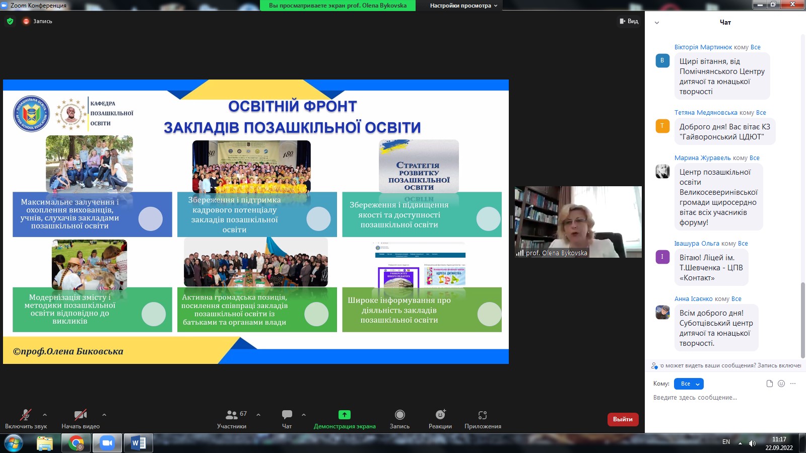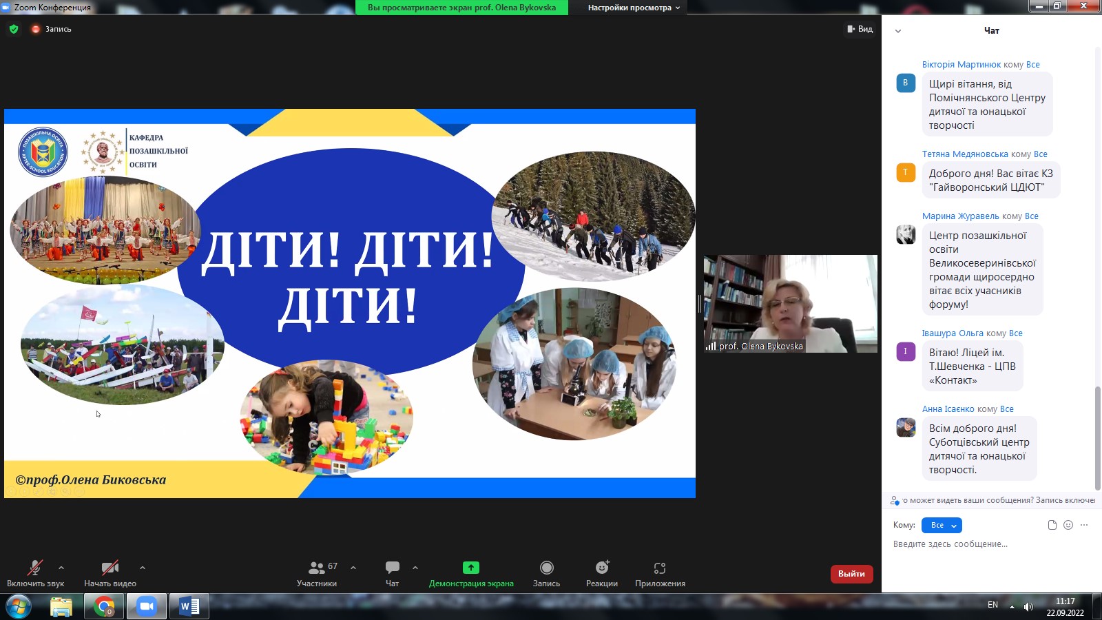 22 вересня 2022 року, науково-педагогічні працівники кафедри педагогіки та спеціальної освіти ЦДУ ім.В.Винниченка, із групи забезпечення магістерської програми «Позашкільна освіта», взяли участь в обласному педагогічному форумі позашкільників «Креативні практики позашкілля Кіровоградщини в умовах сьогодення» до Дня працівників закладів позашкільної освіти.