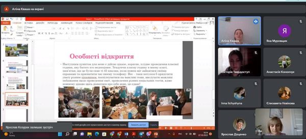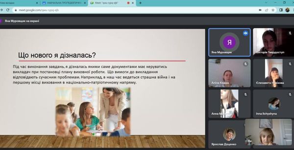 Під керівництвом групового методиста, к.п.н, доцента кафедри педагогіки та спеціальної освіти Кравцової Тетяни Олександрівни студенти спеціальностей 014 Середня освіта (Природничі науки), 014 Середня освіта (Біологія та здоров’я людини), 014 Середня освіта (Хімія), 014 Середня освіта (Географія) продемонстрували власні напрацювання за результатами виконання завдань практики, поділилися враженнями від проведеної роботи під час виконання різних завдань практики, презентували інноваційні методи та форми роботи під час дистанційного навчання.