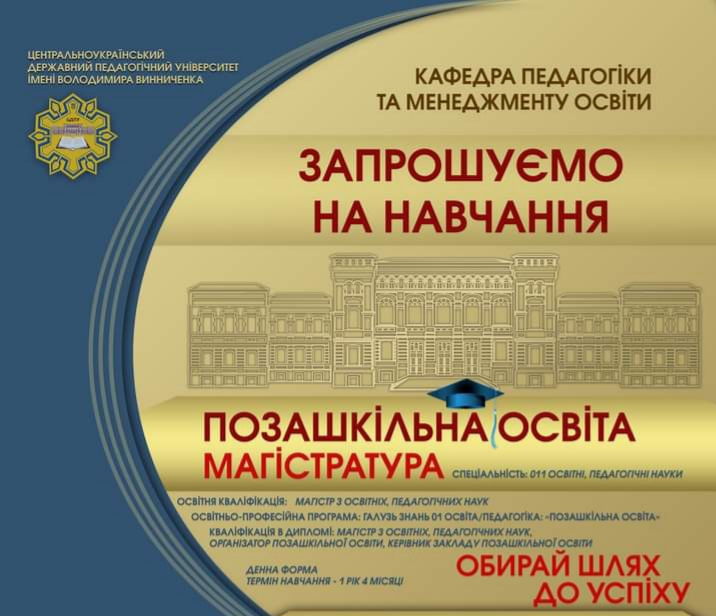 23 та 24 грудня 2021 року відбувся успішний захист студентами другого (магістерського) рівня кафедри педагогіки та менеджменту освіти ЦДПУ ім. В. Винниченка освітніх спеціальностей: 011 Освітні, педагогічні науки освітньо-професійних програм Освітні, педагогічні науки (Педагогіка вищої школи) денної та заочної форми навчання та Освітні, педагогічні науки (Позашкільна освіта) денної форми навчання. 28 грудня свої кваліфікаційні роботи захистили магістри спеціальності 073 Менеджмент освітньо-професійної програми Управління навчальним закладом денної та заочної форми навчання.