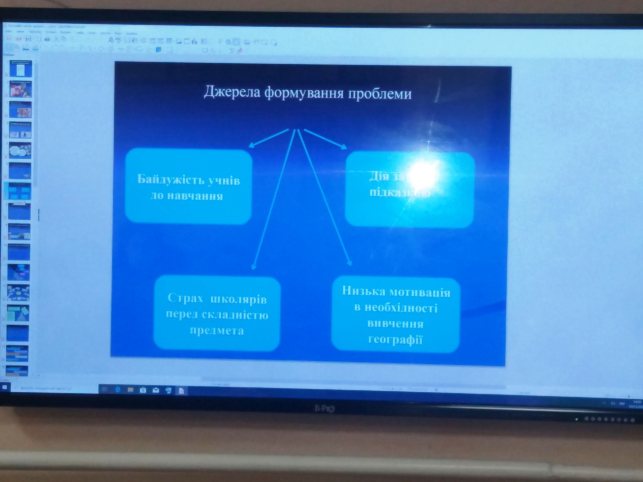 Лекцію було проведено в рамках вивчення дисципліни «Методика навчання географії» та підготовки до проведення виробничої (педагогічної) практики у школі. Головною метою було ознайомлення студентів з проблемами та перспективами сучасної географічної освіти, розкриття нових підходів у навчанні географії та аналіз нормативного поля шкільної географічної освіти.