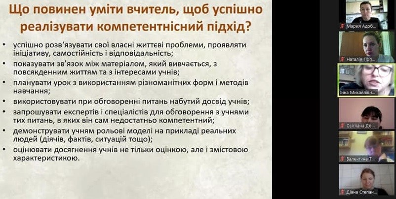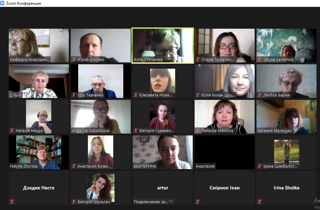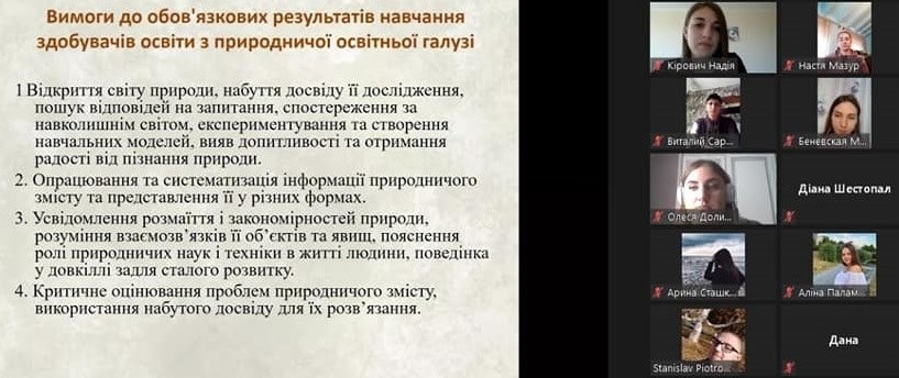 07 квітня студенти першого (бакалаврського) і другого (магістерського) рівнів вищої освіти спеціальності 014 Середня освіта (Географія), які навчаються за освітньо-професійними програмами «Середня освіта (Географія) та краєзнавчо-туристична робота», «Середня освіта (Географія та Історія)», «Середня освіта (Географія та Мова і література (англійська))» та викладачі кафедри географії і геоекології Центральноукраїнського державного педагогічного університету імені Володимира Винниченка відвідали лекцію в онлайн-форматі з теми «Навчання предметів природничої освітньоі галузі на засадах компетентнісного підходу», яку провела стейкхолдер Ярошенко Ольга Григорівна, доктор педагогічних наук, професор, академік Національної академії педагогічних наук (НАПН) України, головний науковий співробітник Відділу інтеграції вищої освіти і науки Інституту вищої освіти НАПН України.
