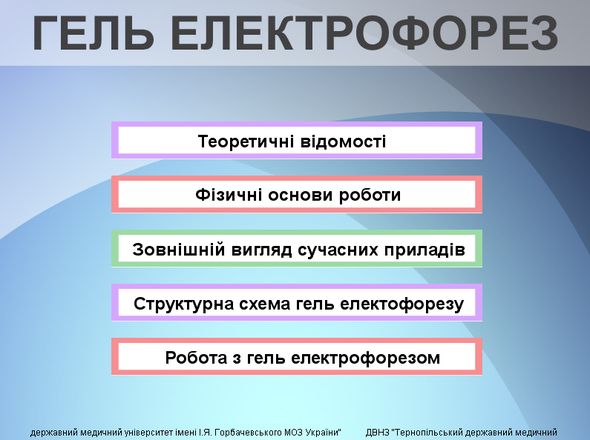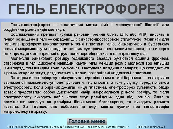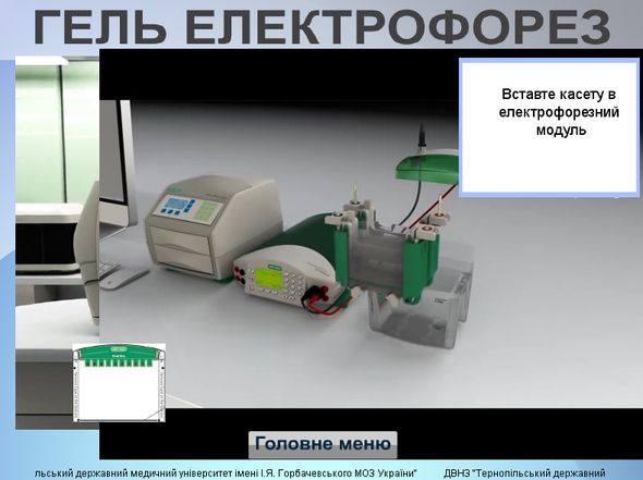 У головному меню усі пункти розставлені в тому порядку, в якому повинні виконуватись та розглядатись. Таким чином, при виконанні вказівок з ознайомлення та вивчення системи гель електрофорезу, це дозволить зменшити часові рамки та збільшити ефективність сприйняття інформації.