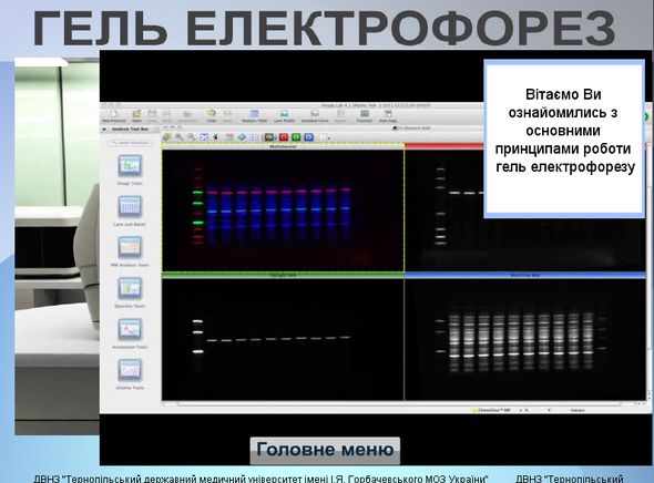 Рис.1. Головне меню віртуального навчального тренажера «Гель електрофорез»