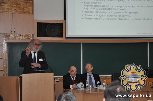 Ну, а 18 березня у першій половині дня гість конференції, імпозантний професор Інституту перекладу та міжкультурної комунікації Технічного університету міста Кельн Клаус-Дірк Шміц провів навчальний семінар-зустріч із колегами та студентами, присвячений магістерській програмі з термінології в його рідному університеті та її місці в парадигмі загальноєвропейської магістерської програми-стандарту із підготовки перекладача (EMT).