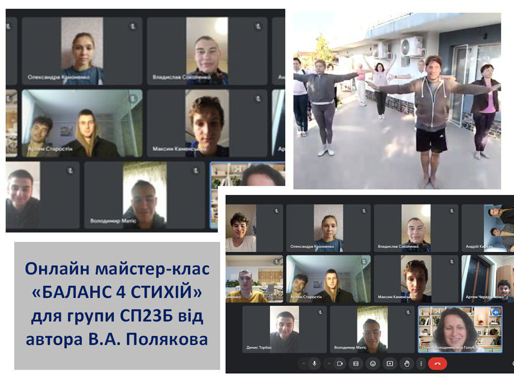 Доброю традицією нашого вишу стало запрошення фахівців галузі до практичних занять студентів. Майстер-клас "Баланс 4-х стихій" для студентів ІІ курсу групи СП23Б факультету фізичного виховання в програмі навчальної дисципліни "Засоби фітнесу в фізичній культурі і спорті" провів автор унікальних психофізичних вправ, науковець, новатор і громадський діяч, організатор Громадської спілки "Міжнародна наукова школа універсології" В.А. Поляков.