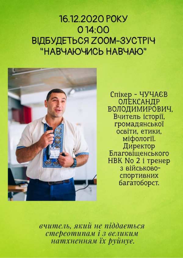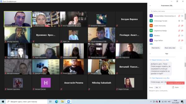 16 грудня 2020 року відбулася онлайн-зустріч студентів та викладачів факультету історії та права з Олександром Чучаєвим, директором Благовіщенського навчально-виховного комплексу № 2 «Закладу загальної середньої освіти І-ІІІ ступенів – закладу дошкільної освіти «Дивоцвіт» Благовіщенської районної ради», учителем історії, тренером з навчальних програм та спортивного єдиноборства.