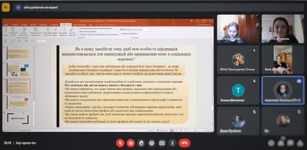 Доповідачки висвітлили питання щодо: поняття булінгу та кібербулінгу; особливостей виявлення булінгу та кібербулінгу; запобігання насильству серед школярів; механізмів протидії кривднику. Тема зацікавила учнів та викликала жваву дискусію.