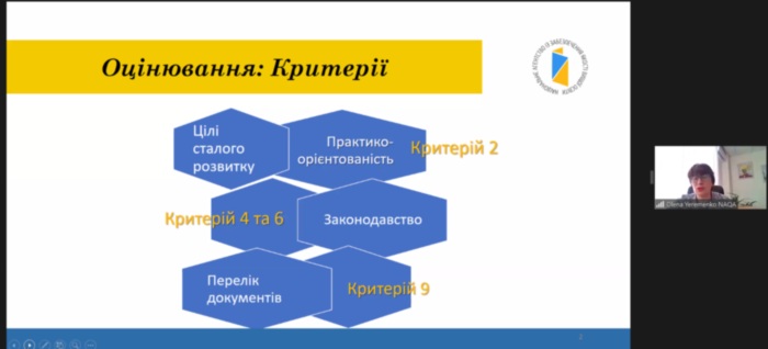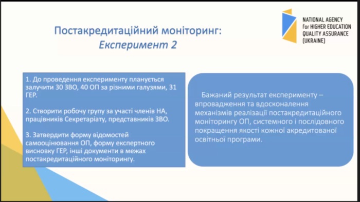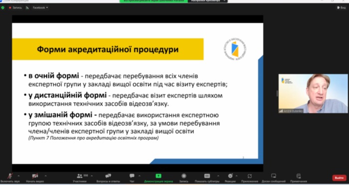 У ході вебінару були порушені актуальні питання акредитації освітніх програм. Виступ голови Національного агентства із забезпечення якості вищої освіти Андрія Бутенка був присвячений питанню оновленого Положення про акредитацію освітніх програм у контексті змін для університетів. Заступник голови Національного агентства із забезпечення якості вищої освіти Олена Єременко звернула увагу учасників зустрічі на процедуру та зміст оцінювання освітніх програм відповідно до нового Положення про акредитацію.