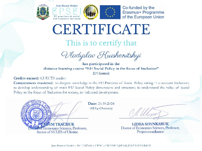 Участь у заходах у межах проєкту EPSEI дозволила здобувачу третього (освітньо-наукового) рівня розширити свої знання про сучасні тенденції розвитку Європейського Союзу та поглибити розуміння інклюзивних підходів у різних сферах життя.