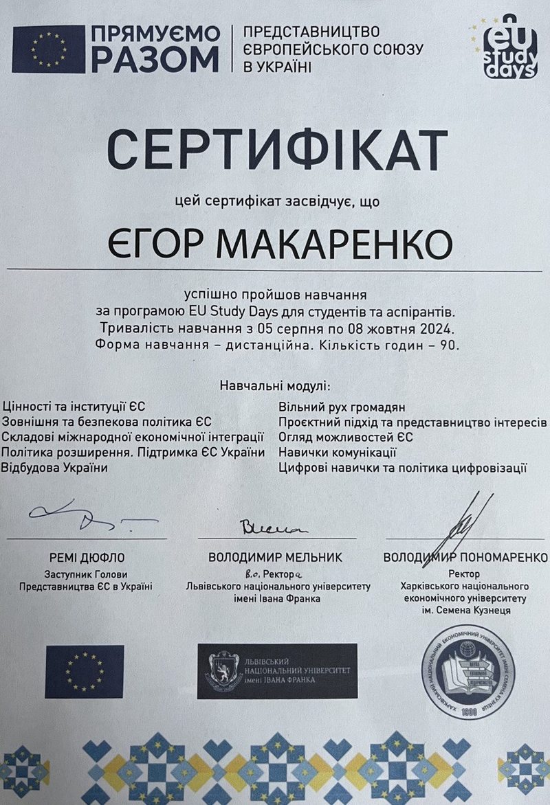 Здобувач магістерського рівня вищої освіти за спеціальністю 014.03 Середня освіта (Історія та громадянська освіта) Макаренко Єгор успішно пройшов конкурсний відбір і став учасником престижної навчальної програми EU Study Days.
