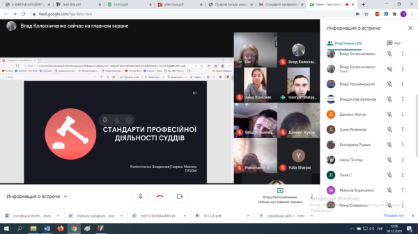 12 грудня 2020 року на базі Центральноукраїнського державного педагогічного університету ім. Володимира Винниченка за участю науково-педагогічних працівників кафедри державно-правових дисциплін та адміністративного права і кафедри галузевого права та правоохоронної діяльності, та за участі здобувачів (аспірантів) третього освітньо-наукого рівня за спеціальності 081 Право, із використанням платформи ZOOM, відбулася чергова робоча зустріч. На порядку денному було розглянуто звіти аспірантів щодо виконання освітньо-наукової програми за перше півріччя навчального року.