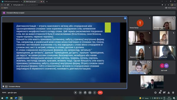 У конкурсі взяли участь 11 першокурсників факультету української філології, іноземних мов та соціальних комунікацій: Вікторія Луценко, Максим Огер, Анастасія Манич, Катерина Волошина, Анастасія Гусєва, Марія Суржик, Богдана Мотько, Тетяна Ткачук, Єлизавета Маляр, Катерина Коваленко та Марина Іщенко. Вони підготували цікаві й змістовні доповіді з мультимедійними презентаціями про українську мову як національну, як унормовану форму загальнонародної, про види філологічних словників та книжну лексику, про ономастику та етимологію як окремі галузі науки. Присутніх ознайомили з основними аспектами розвитку української лексикографії в ХІХ столітті, з головними класифікаціями омонімів, із тропами – метафорою, метонімією, синекдохою, що є типами переносних уживань слів, з групами лексем, запозичених у різні часи з німецької мови, з особливостями лексики розмовного стилю. За умовами конкурсу кожен учасник відповів на два запитання.
