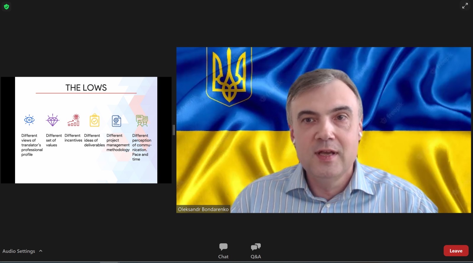 18 березня 2022 року доцент кафедри перекладу, прикладної та загальної лінгвістики, директор перекладацької компанії “Translatel”, член консорціуму CTER (Consortium for Translation Education Research) Бондаренко Олександр Сергійович виступив на пленарному засіданні Конгресу “Re-(profiling) Translaiton Pedagogy” із доповіддю на тему “TRANSLATION INTERNSHIP: HOW TO MAKE IT A WIN-WIN FOR INDUSTRY AND ACADEMIA”.
