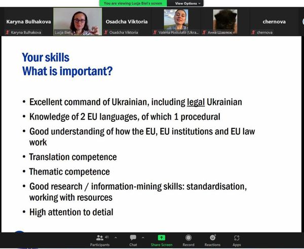 Ми дбайливо зберегли всі посилання, якими з нами поділилася Lucia Biel, і використовуватимемо їх під час курсів із юридичного перекладу й перекладу нормативно-правових актів ЄС, які викладаються на другому (магістерському) рівні навчання. Саме після таких зустрічей студентам відкриваються нові перспективи й нові горизонти, які надихають вчитися і розвиватися. Сподіваємося, що саме наші випускники в майбутньому перекладатимуть для Європейських інституцій і також долучаться до перекладу незліченної кількості сторінок нормативно-правових актів ЄС.