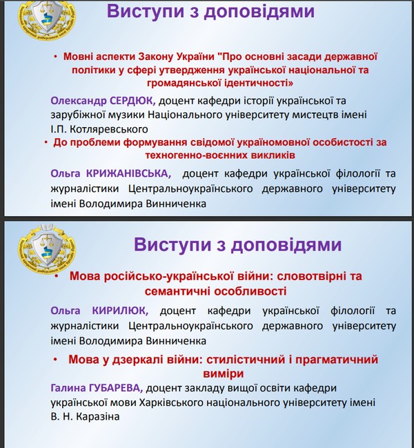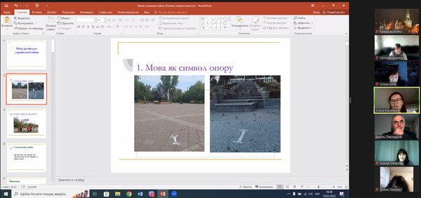 Непідробний інтерес в учасників викликали доповіді доцента кафедри української філології та журналістики О. І. Крижанівської «До проблеми формування свідомої україномовної особистості за техногенно-воєнних викликів» та доцента, завідувача нашої кафедри О. Л. Кирилюк «Мова російсько-української війни: словотвірні та семантичні особливості».