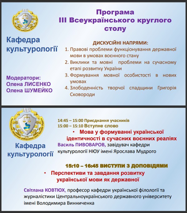 10 лютого 2023 року прогресивні сили мовознавчого сектору кафедри української філології та журналістики взяли участь у ІІІ Всеукраїнському круглому столі «Актуальні питання функціонування і розвитку державної мови в Україні», організованому кафедрою культурології Національного юридичного університету імені Ярослава Мудрого (м. Харків). Воістину харків’яни – мужні люди.