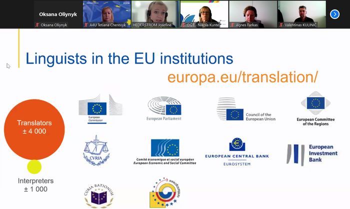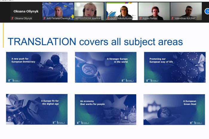 Жозефіна Хедерштром (Josefine Hederstrom), Агнес Фаркас (Agnes Farkas) та Ніколя Кунте (Nicola Kunte) розповіли про структуру, завдання й функції DGT, ресурси й інструменти, які перекладачі текстів інституцій ЄС використовують під час роботи, а також мережу EMT (European Master in Translation, Європейський Магістр з перекладу), вимоги до магістерських програм університетів-членів. На онлайн-конференції також були присутні перекладачка Тетяна Жарко та представник Генерального директорату письмового перекладу Валентінас Кулініч (Valentinas Kulinič), які більш докладно зупинилися на проблемах перекладу юридичних текстів, зокрема й нормативно-правових актів ЄС, а також технологіях перекладу, які використовуються в перекладацькій роботі.