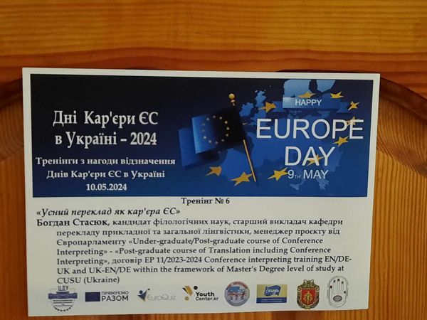 Саме тому 10 травня, у межах відзначення Дня кар’єри ЄС, який цьогоріч відбувався на базі Центральноукраїнського державного університету імені Володимира Винниченка, викладач усного перекладу з англійської мови, к. філол. н. Богдан Стасюк зустрівся не тільки з першокурсниками кафедри перекладу, прикладної та загальної лінгвістики, що їм іще належить вирішити, який саме з різновидів перекладацької професії їх цікавить найбільше, а й учнями Наукового ліцею, перед котрими вже найближчим часом постане питання вибору майбутньої професії.