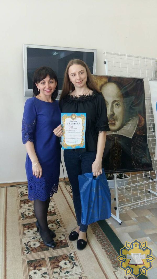Розпочався захід із сумної ноти – хвилини мовчання, таким чином усі присутні вшанували пам’ять Данілко Маргарити Іванівни, голови Спілки англійської мови в Україні, яка напередодні пішла з життя, але назавжди залишиться у нашій пам’яті. Після цього один за одним 27 учасників півфіналу демонстрували свої здібності у декламуванні сонетів, і 9 конкурсантів ввійшли до фіналу. У завершальному етапі конкурсу члени журі визначили своїх фаворитів та оголосили імена переможців, яких нагородили щедрими подарунками та грамотами. Відтак, 3 місце посіли відразу двоє учасників – Вадим Білодід (студент будівельного коледжу м. Гайворон) та Анна Охлобяк (Кіровоградська гімназія нових технологій навчання), на 2 місці опинилась студентка 1 курсу ЦДПУ Дарія Пучніна. А найбільше того дня фортуна посміхнулася мені – студентці 2 курсу ЦДПУ Олені Джус, я посіла 1 місце.