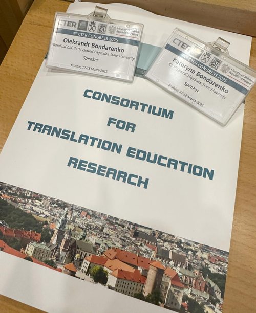 17.03.2025 – 18.03.2025 доценти кафeдри перекладу, прикладної та загальної лінгвістики Бондаренко О.С. та Бондаренко К.Л. взяли участь у Четвертому Конгресі Консорціуму з досліджень перекладацької освіти (CTER 2025) на тему «New Value(s) in Translation Pedagogy: (Re-)Positioning Human Translation and Interpreting».