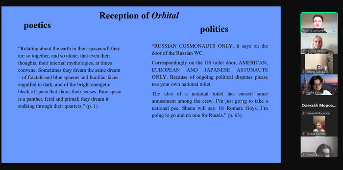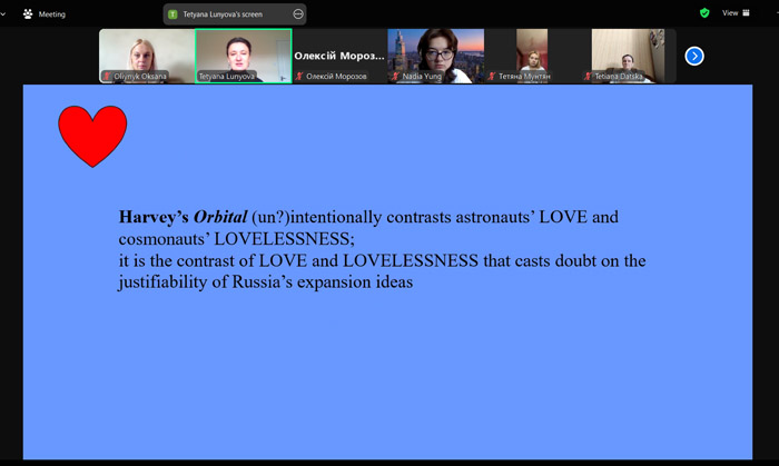Відкриту лекцію пані Тетяна присвятила аналізу роману англійської письменниці Саманти Гарві Orbital («Орбітальний»), який став лауреатом Букерівської премії 2024 року. Твір здобув неоднозначні відгуки серед українських читачів через романтизовані згадки про російських астронавтів, які було сприйнято як політичний заклик до «тотального замирення» з Росією й відверте ідеалізування агресора. Лекторка порівняла два плани роману: поетичний і політичний – створюючи наратив, який і зворушує серце, і змушує замислитися над долею світу. Вона акцентувала увагу на протиставленні в романі ЛЮБОВІ, яка присутня в житті астронавтів, і ВІДСУТНОСТІ ЛЮБОВІ в житті росіян-космонавтів, яке породжує риторичне запитання: а що ж такого хорошого несе в собі поширення «русского мира»?