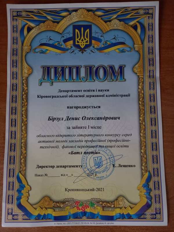 Перше місце – БІРЗУЛ Денис Олександрович, студент факультету філології та журналістики Центральноукраїнського державного педагогічного університету ім. Володимира Винниченка, м. Кропивницький;