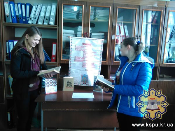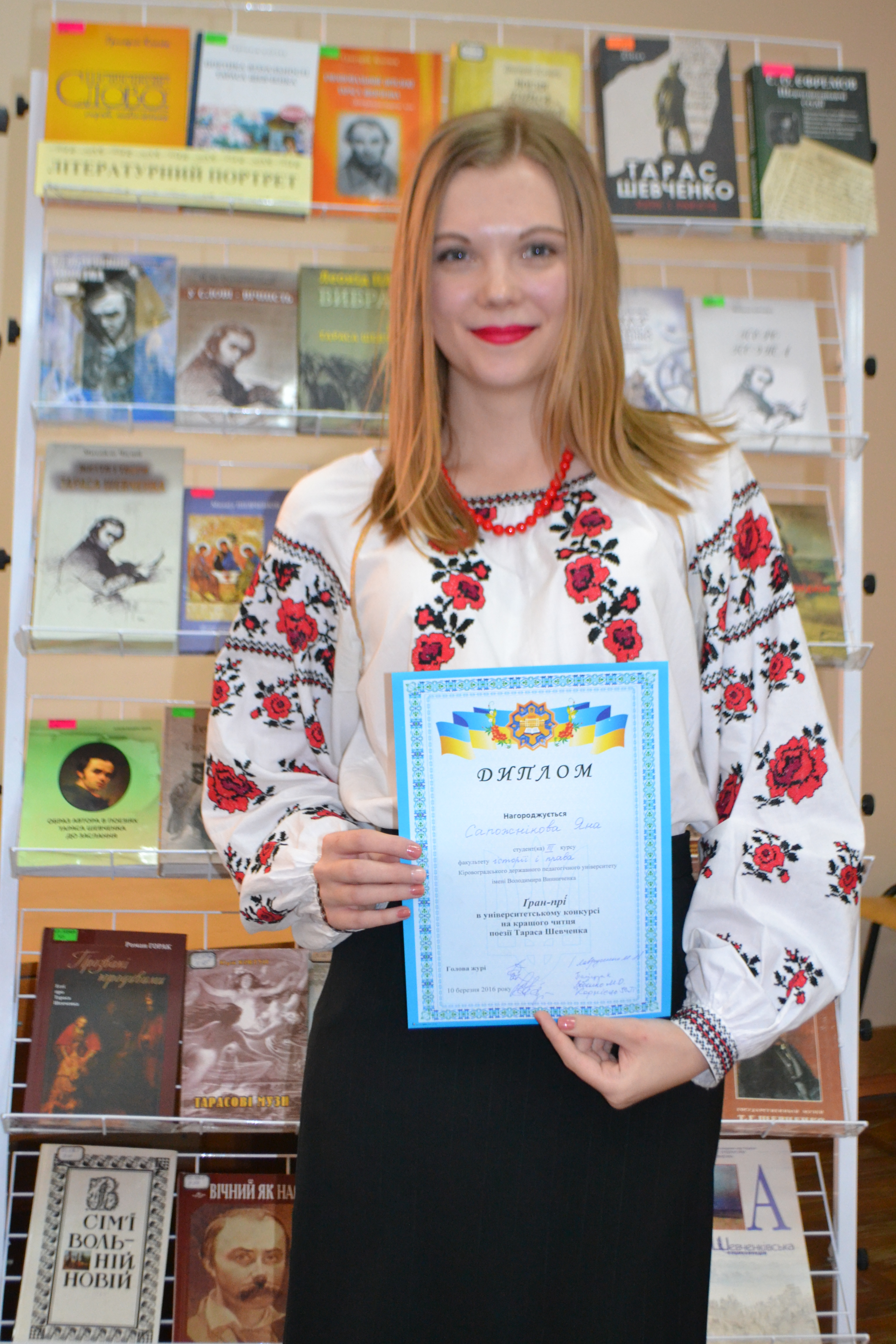 Традиційно у стінах факультету філології та журналістики проводиться університетський конкурс на кращого читця поезій Шевченка. Цього року організатором була Марія Зобенко – розумна, талановита, ініціативна студентка 22-ї групи, яка зуміла зібрати навколо себе тих, хто не побоявся заговорити мовою Шевченка, яка створила разом із працівниками бібліотеки ефект присутності Кобзаря – виставка книг, портрети, українська символіка.