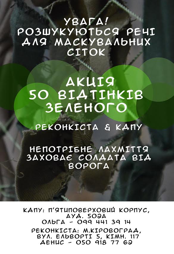 Активістам потрібна тканина зеленого кольору для плетіння маскувальних сіток для наших захисників.