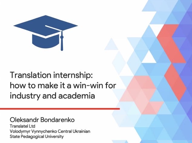 18 березня 2022 року доцент кафедри перекладу, прикладної та загальної лінгвістики, директор перекладацької компанії “Translatel”, член консорціуму CTER (Consortium for Translation Education Research) Бондаренко Олександр Сергійович виступив на пленарному засіданні Конгресу “Re-(profiling) Translaiton Pedagogy” із доповіддю на тему “TRANSLATION INTERNSHIP: HOW TO MAKE IT A WIN-WIN FOR INDUSTRY AND ACADEMIA”.
