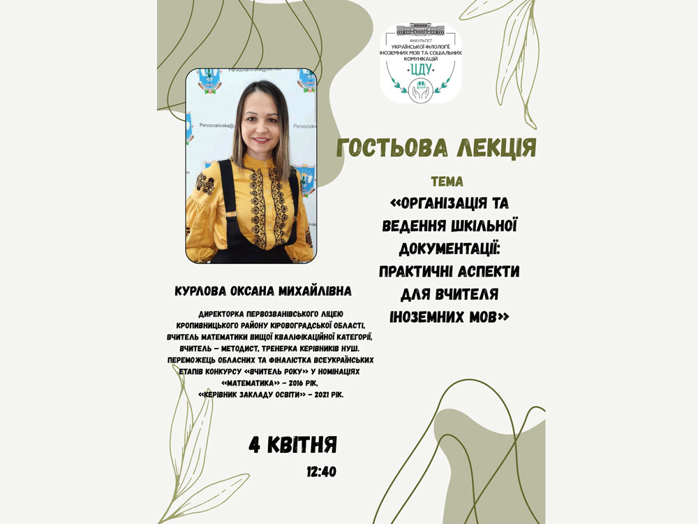 4 квітня о 12.00 директорка Первозванівського ліцею Кропивницького району Кіровоградської області Курлова Оксана Михайлівна прочитає гостьову лекцію на тему: «Організація та ведення шкільної документації: практичні аспекти для вчителя іноземних мов».
