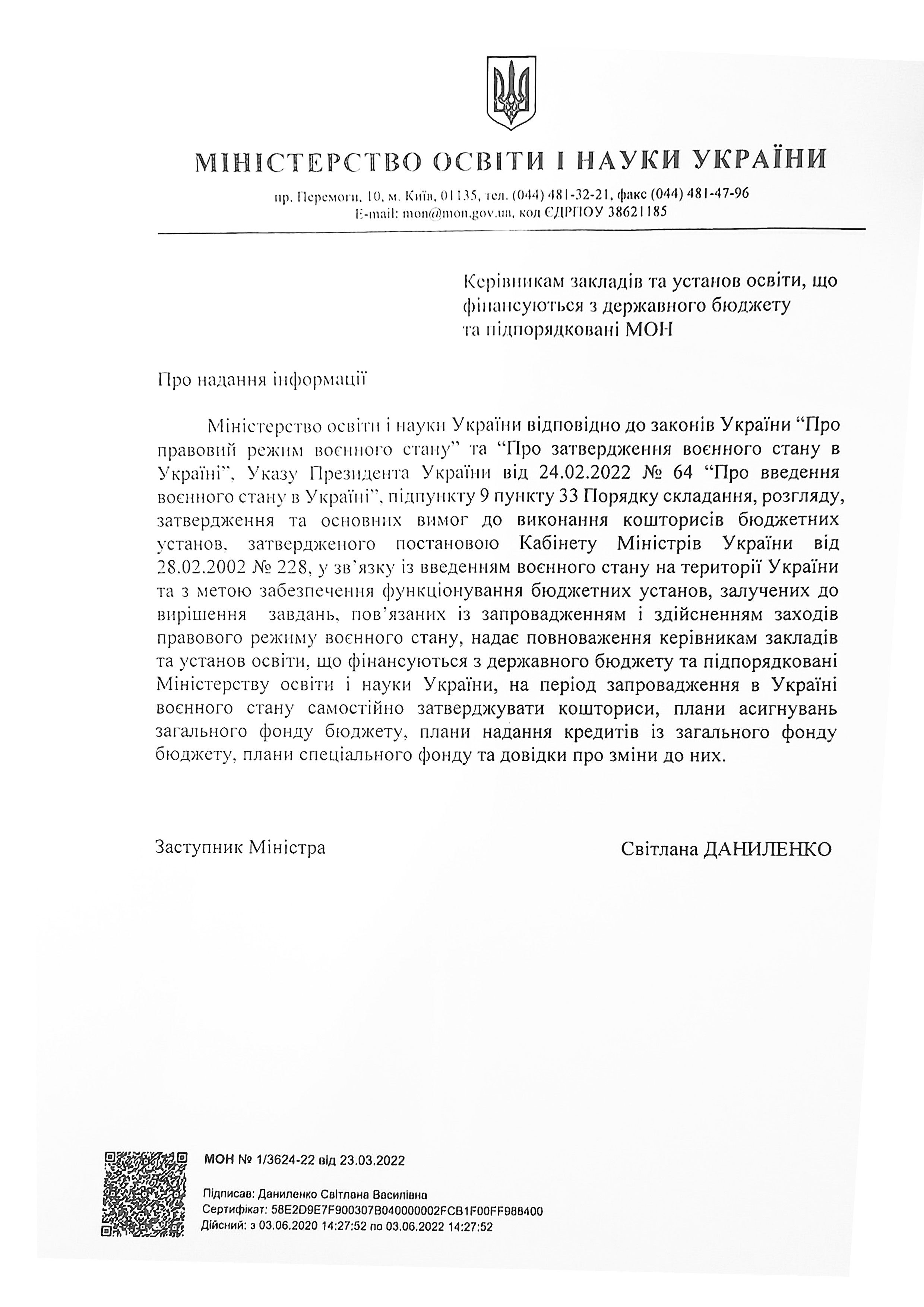 - Лист Міністерства освіти і науки України від 23.03.2022 № 1/3624-22 про надання повноважень керівникам закладів та установ освіти, що фінансуються з державного бюджету та підпорядковані МОН України, на період запровадження в Україні воєнного стану, самостійно затверджувати кошториси, плани асигнувань загального фонду бюджету.