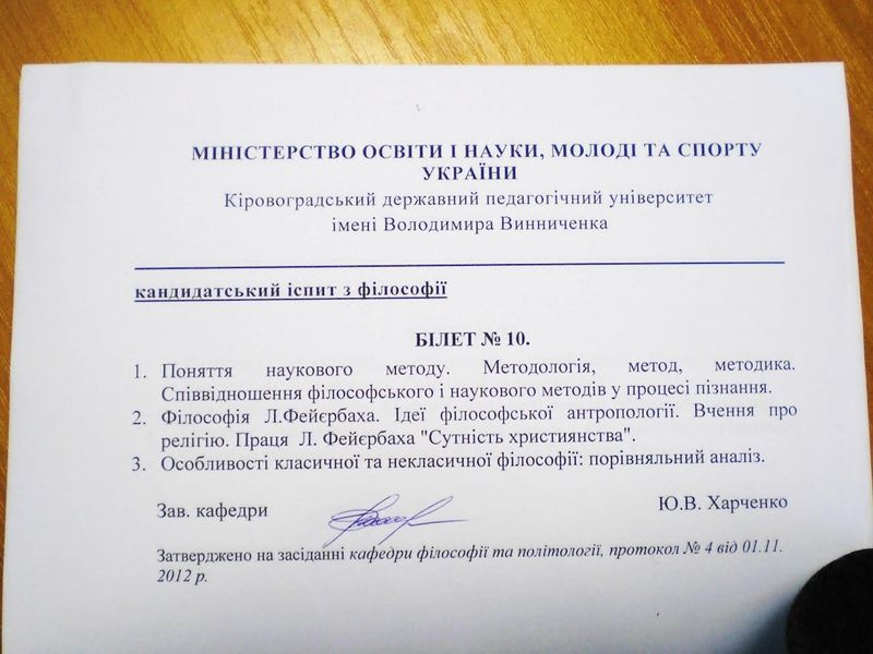 У кінці листопада 2013 р. в університеті проведено кандидатський іспит з філософії. Такий екзамен є обов’язковим для майбутніх кандидатів наук. Він включає ґрунтовні філософські питання і допомагає молодим вченим розібратись у методологічних проблемах, пов’язаних з їхніми дослідженнями. Наприклад, білет №10 вимагає ґрунтовних знань з методології як загальнонаукового методу дослідження, слід розкрити філософію Л.Фейєрбаха тощо.