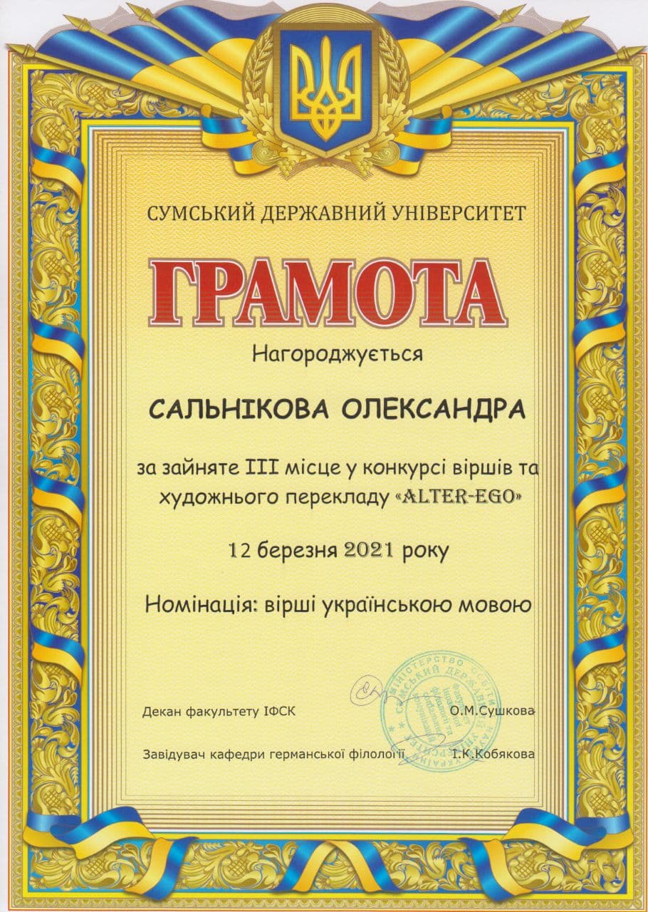 Студентки 3 курсу факультету іноземних мов Олександра Сальнікова та Кароліна Саламашенко стали призерками Всеукраїнського конкурсу поезій та художнього перекладу “Alter Ego”, який проводив Сумський державний університет. Олександра посіла почесне 3-тє місце у номінації «Вірш українською мовою». Кароліна – 3-тє місце у номінації «Вірш англійською мовою».