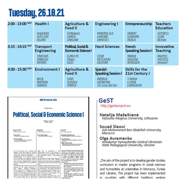 До участі у Віртуальному ярмарку проєктів Еразмус+ СВНЕ обрано проєкт «Гендерні студії: Крок до демократії та миру у сусідніх з ЕС країнах з різними традиціями» (ГеСт). Віртуальний ярмарок відбувся 26–27 жовтня на платформі Airmeet.