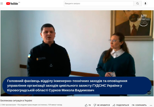 Під час онлайн-зустрічі в режимі реального часу виступили сапер піротехнічного відділення групи піротехнічних робіт аварійно-рятувального загону спецпризначення ГУДСНС України у Кіровоградській області Андрій Геннадієвич Дмитрієнко, головний фахівець відділу інженерно-технічних заходів та оповіщення управління організації заходів цивільного захисту ГУДСНС України у Кіровоградській області Микола Вадимович Сурков та заступниця начальника відділу соціально-гуманітарної роботи та психологічного забезпечення ГУДСНС України у Кіровоградській області Євгенія Русланівна Погрібна.