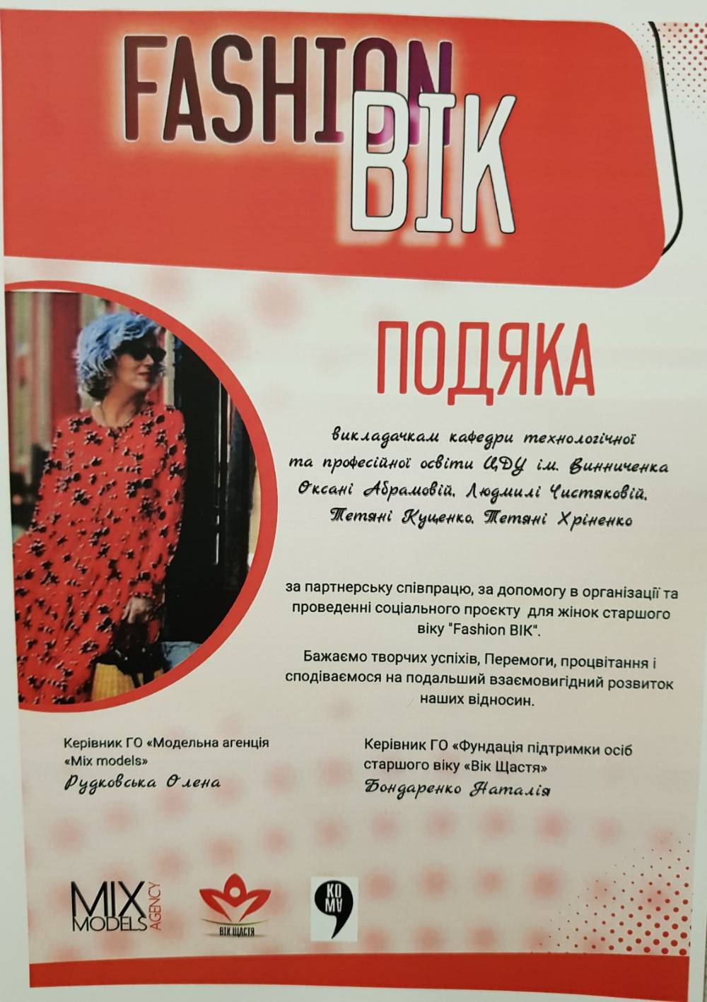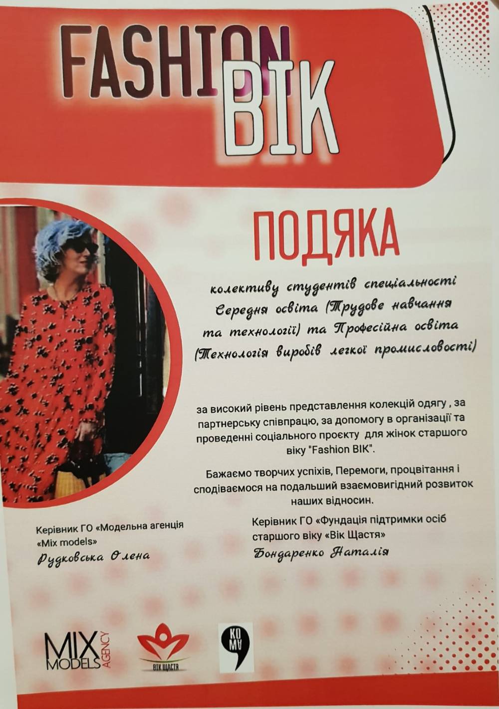 7 квітня 2023 року на показі мод «Fashion Вік», організованому в рамках соціального проєкту для жінок старшого віку, студентки спеціальностей Середня освіта (Трудове навчання та технології) та Професійна освіта (Технологія виробів легкої промисловості) представили п’ять власноруч виготовлених колекцій одягу, виконаних під керівництвом викладачок кафедри технологічної та професійної освіти Оксани Абрамової, Тетяни Куценко, Людмили Чистякової та Тетяни Хріненко. До організаційних процесів та презентації активно долучилися студентки факультету математики, природничих наук та технологій Анастасія Рябченко та Марина Рябоконь.