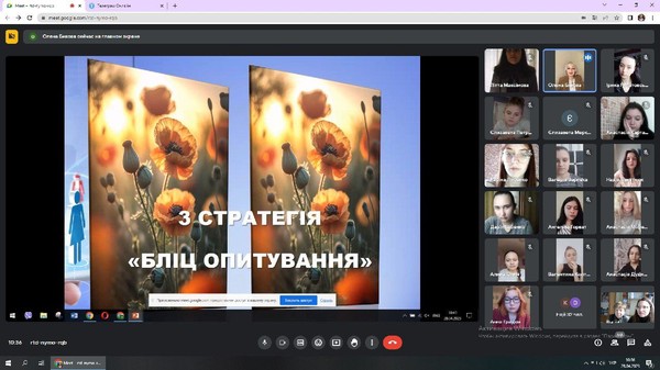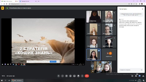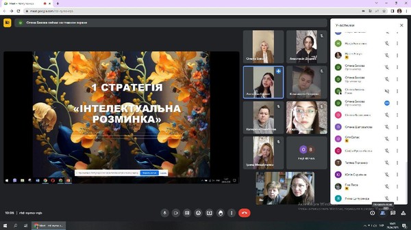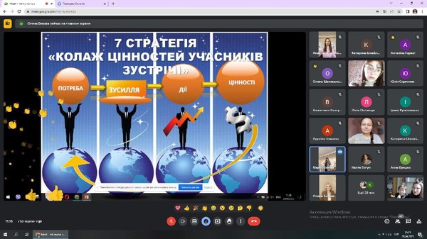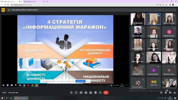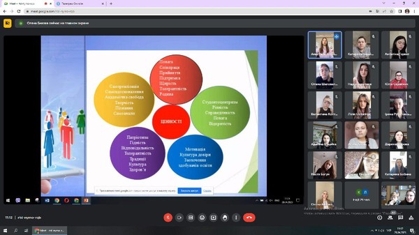 Захід було вибудовано за такими стратегіями: «Інтелектуальна розминка», «Кошик знань», «Бліц-опитування», «Інформаційний марафон», «Бліц-презентація», «Професійний довідник», «Колаж цінностей учасників зустрічі». Відбувся жвавий обмін думками з обох сторін — студенти поділилися власним баченням проблеми цінностей. Емоційну реакцію студентів викликали проблеми: «Особистісні цінності громадянина України» та «Цінності освіти в умовах війни». Відповіді студентів показали, що майбутні фахівці небайдужі до подій, що відбуваються в державі, та налаштовані на подальший розвиток особистісних цінностей та формування громадянський цінностей у прийдешніх поколінь.