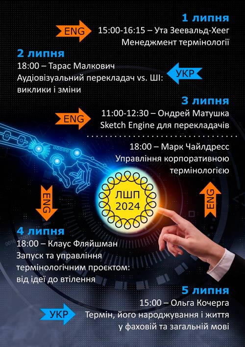 Темою цьогорічної ЛШП стала термінологія, зокрема, її роль у бізнес-процесах, наданні лінгвістичних послуг, євроінтеграційних зусиллях України тощо. Доповідачами ЛШП 2024 стали представники академічної спільноти: Ута Зеевальд-Хеег (Ангальтський Університет прикладних наук) та Ольга Кочерга (Інститут теоретичної фізики ім.М.М.Боголюбова НАН України); представники бізнесу: Клаус Флайшманн (компанії “Eurocom” та “Kaleidoscope”), Марк Д. Чайлдресс (компанія “SAP SE”), Ондрей Матушка (компанія “Lexical Computing”), Тарас Малкович (“Tapas Localization").