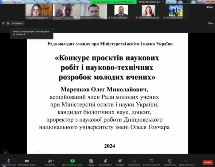 З метою популяризації інформації про конкурс та пояснення особливостей підготовки та подачі заявок 06 вересня 2024 р. Радою молодих вчених при МОНУ була організована онлайн-зустріч із проректором з наукової роботи Дніпровського національного університету імені Володимира Винниченка Олегом Маренковим. Олег Миколайович не тільки пояснив особливості участі у конкурсі, а й поділився власним досвідом участі в конкурсах проєктів. Учасником заходу стала д.пед.н., проф., завідувач кафедри математики та цифрових технологій Центральноукраїнського державного університету імені Володимира Винниченка Олена Трифонова.