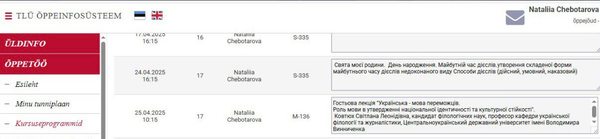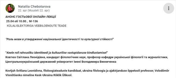 Лекцію було прочитано на запрошення колишньої учениці та студентки професора С.Л.Ковтюх, випускниці нашого знаного університету імені Володимира Винниченка Наталії Володимирівни Чеботарьової, яка, пройшовши серйозний фаховий конкурс (слава альма-матер!), виборола право бути викладачем інституту гуманітарних наук Tallinna Ülikool і читати для естонців українську мову. Заслуговує на повагу прагнення молоді братньої країни Балтії (яка не втомлюється допомагати нам у протистоянні російським загарбникам) опанувати нашу рідну солов’їну. С.Л.Ковтюх також використовувала естонські слова: tere – привіт, добрий день, aitäh – дякую, suur tänu – дуже дякую, head aega – до побачення.