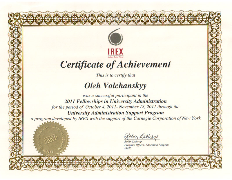 Гранти надаються представникам адміністрації університетів для проходження 7-тижневого стажування у державних університетах США. У рамках програми кожен учасник працює в парі з представником американського університету за темою свого проекту у сфері вдосконалення управління університетами і до кінця стажування надає докладний звіт про результати свого дослідження і можливості використання даного досвіду в вузах України Олег Володимирович розробляв проект "Корпоративні дослідження в американських університетах". Для проходження стажування він був направлений до Університету північного Техасу (м.Дентон, Техас, www.unt.edu).