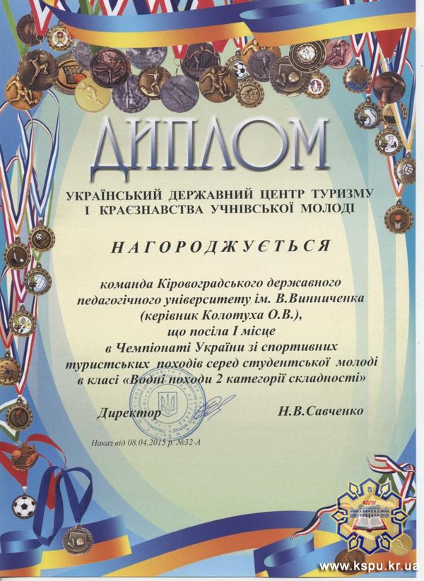 Наприкінці березня 2015 року в м. Києві відбулося суддівство Чемпіонату України зі спортивних туристських походів учнівської молоді 2014 року. Для участі в Чемпіонаті серед студентських туристських груп були представлені 2 походи, здійснені туристськими групами туристичного клубу «Мандри» Кіровоградського державного педагогічного університету іменіВолодимира Винниченка протягом минулого року.