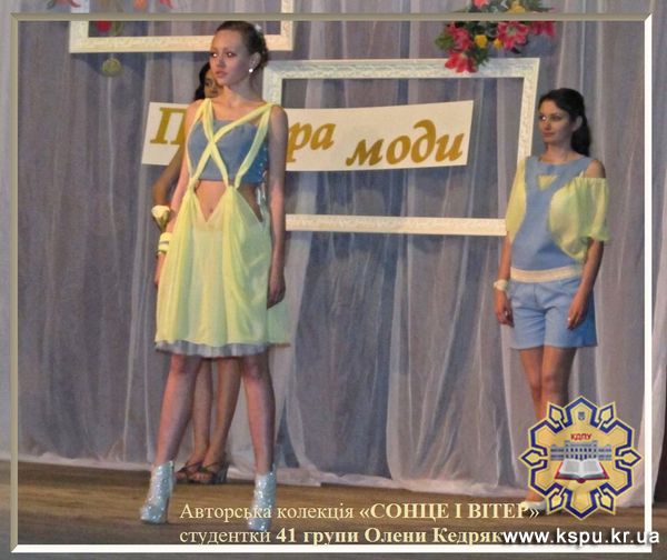 Колекція студентки О. Кедряк «Сонце і вітер» виготовлена з м’якого і ніжного шифону, фактурного джинсу. Пастельна гама кольорів створює легкі, свіжі, літні образи. Таке несподіване поєднання створює образ впевненої в собі та екстравагантної жінки.